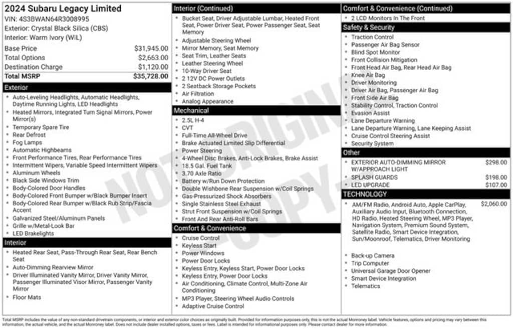 Crystal Black Silica 2024 Subaru Legacy Limited AWD Lineartronic CVT 2.5L 4-Cylinder DOHC 16V