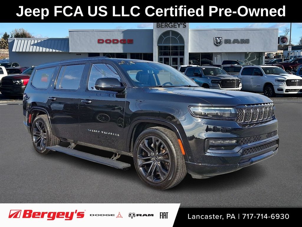Certified. Black 4D Sport Utility CARFAX One-Owner. 2022 Jeep 13/18 City/Highway MPG Grand Wagoneer Series II 4WD 8-Speed Automatic 6.4L V8 23 Speaker McIntosh Reference Audio System, 3rd row seats: bench, Adjustable Roof Rail Crossbars, Auto-leveling suspension, Black Interior Accents, Black Roof, Cargo Cover, Front Bucket Seats, Front Console Cooler, Front Passenger Interactive Display, Genuine wood console insert, Genuine wood dashboard insert, Genuine wood door panel insert, Gloss Black Upper & Lower DLO Molding, Heated front seats, Heated rear seats, Heated steering wheel, Leather steering wheel, Leather Trimmed Bucket Seats, Obsidian Appearance Package, Piano Black Exterior Accents, Power Liftgate, Power moonroof, Power passenger seat, Premium Tinted Glass, Quick Order Package 23T Obsidian, Reclining 3rd row seat, Split folding rear seat, Ventilated front seats, Ventilated Rear Seats, Wheels: 22" x 9.0" Tinted Polished w/Black Insert.