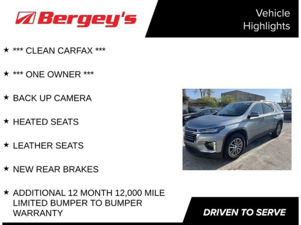 Recent Arrival! *** CLEAN CARFAX ***, *** ONE OWNER ***, BACK UP CAMERA, HEATED SEATS, LEATHER SEATS, NEW REAR BRAKES, ADDITIONAL 12 MONTH 12,000 MILE LIMITED BUMPER TO BUMPER WARRANTY. Certified. Certification Program Details: *12-Month/12,000-Mile Bumper-to-Bumper Limited Warranty*, whichever comes first, in addition to any remaining original factory Bumper-to-Bumper warranty. See participating dealer and warranty booklet for limited warranty eligibility and coverage details, including limitations and exclusions. *Except for non-GM vehicles in the State of California, where coverage will be provided by a vehicle service contract. Odometer is 7804 miles below market average!18/27 City/Highway MPG2023 Sterling Gray Metallic Chevrolet Traverse FWD 3.6L V6 SIDI VVT 9-Speed Automatic